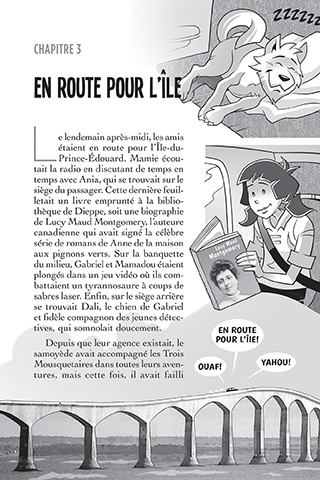 While visiting the region that inspired the novel Anne of Green Gables, the Three Musketeers glimpse the figure of a woman in old-fashioned dress. Could it be the ghost of the author Lucy Maud Montgomery, whose gravestone has recently vanished? Could this apparition be linked to one of Montgomery’s final manuscripts, which has been missing for almost a century? It’s enough to convince the three young detectives and their new friend, an actress in La cuisine à Mémé at the Mont-Carmel, to embark on an exciting, and sometimes even troubling, adventure.