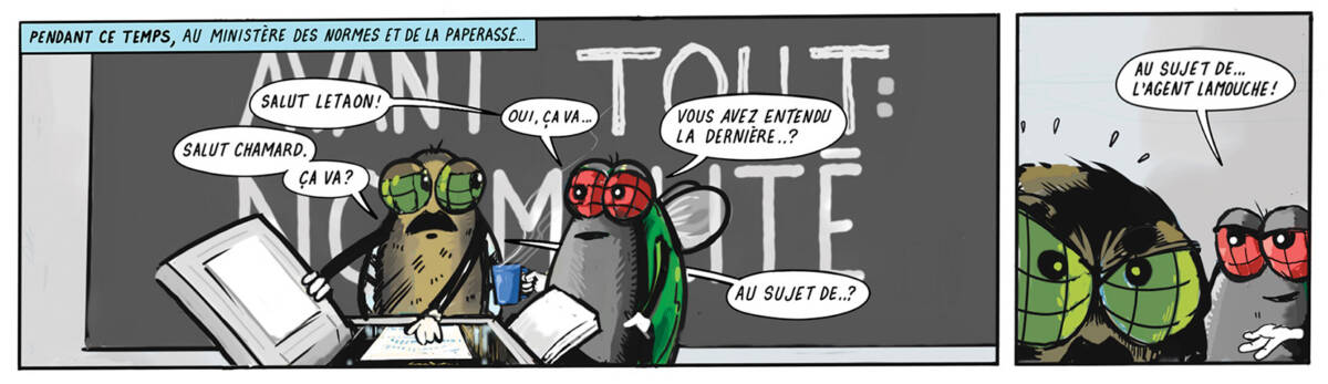 p>Bob Lamouche has been sent by his commander on a mission of the utmost importance: restocking the Moucherie’s sugar supply. Bob Lamouche’s rival takes advantage of his absence to spread a horrible rumour about our hero. According to him, Lamouche does not respect the strict Moucherie employee rules about conforming to the norm! And just then, a strange tornado, not normal at all, plows straight into Lamouche! Bob is launched into an extraordinary universe where he meets strange characters, “crowingbirds” and “poppycocks” among them. Will Lamouche be able to extricate himself from this net of nonsense?